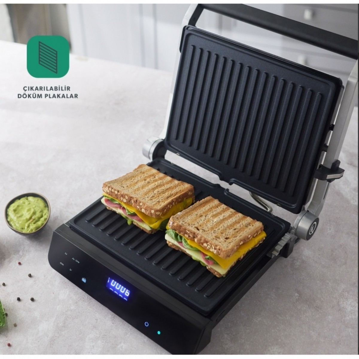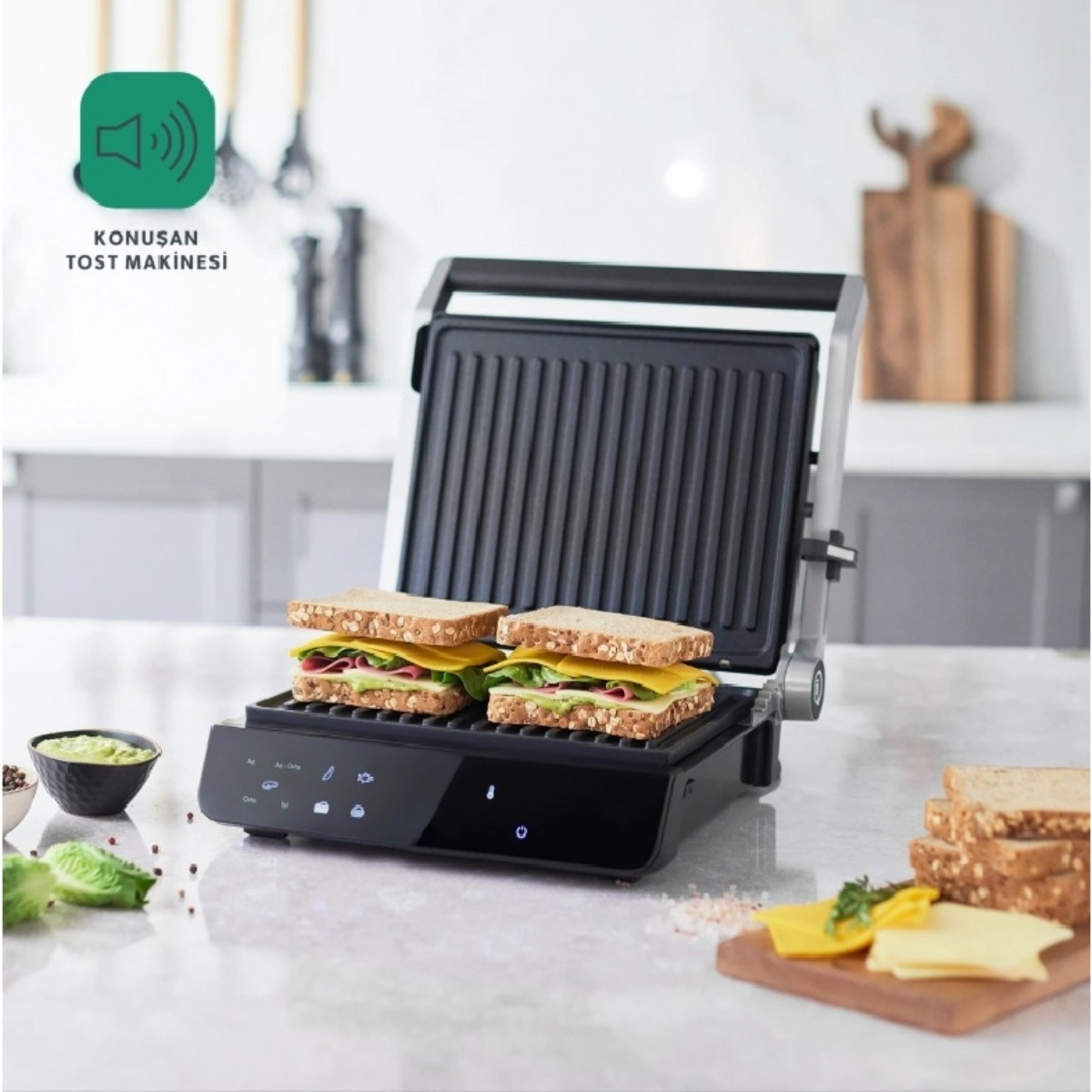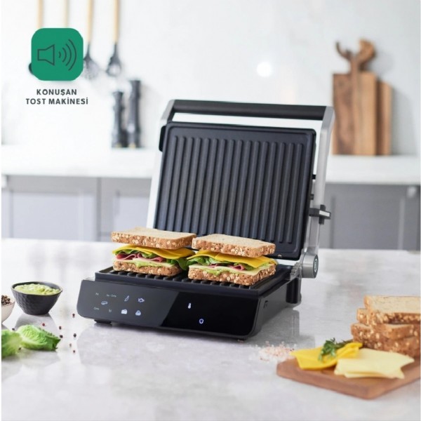 Homend Grilliant 1343H Tost Makinesi, az, az orta, orta ve iyi piÅŸmiÅŸ olmak üzere 4 farklı piÅŸirme seçeneÄŸiyle dilediÄŸiniz yiyeceÄŸi dilediÄŸiniz seviyede piÅŸirir. 5 hazır adet programıyla; sosis, sandviç, hamburger köftesi, balık ve biftek gibi yiyecekleri zahmetsizce hazırlayabilirsiniz. Zamanlayıcı özelliÄŸi sayesinde istediÄŸiniz yiyecek, istediÄŸiniz anda hazır olur. Sizi hiç kırmayıp tüm tariflerinizi hazırlayacak olan tost makineniz, kırılmaz cam yüzeyiyle şık bir görüntü ve güvenli bir kullanım sunar. Takılıp çıkarılabilen döküm plakalar sayesinde tost makinenizi rahatlıkla kullanır, temizler ve kolaylıkla taşırsınız. Üstelik konuÅŸma özellikli tost makineniz, hazırladığı yemekler kadar sohbetiyle de sizi keyiflendirir!